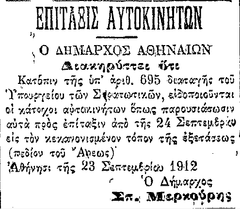 24 Σεπτεμβρίου 1912. Η Ελλάδα προετοιμάζεται για πόλεμο και, ανάμεσα στα άλλα, δημοσιεύεται διαταγή του Υπουργείου Στρατιωτικών, για την επίταξη αυτοκινήτων. Παρόλα αυτά, υπήρξαν ορισμένοι που, για να αποφύγουν την επίταξη, προχώρησαν σε εικονική πώληση και μεταβίβαση των αυτοκινήτων τους, σε ξένους υπηκόους. Η χρονική στιγμή των "μεταβιβάσεων", όμως, δεν πέρασε απαρατήρητη, τουλάχιστον όχι από τον ημερήσιο τύπο. Στη φωτογραφία, η ανακοίνωση για την επίταξη στην Αθήνα.(εφημ. "Εμπρός", 24/9/1912)